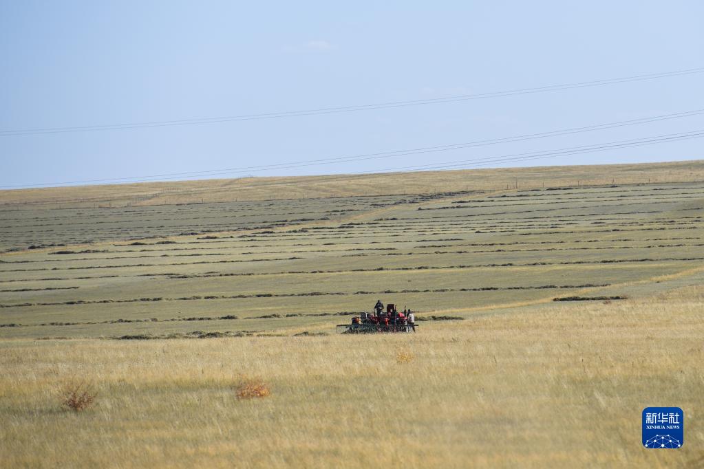 秋日時節,在內蒙古錫林郭勒盟阿巴嘎旗牧區的草原上,牧民開始打草,儲備越冬草料。