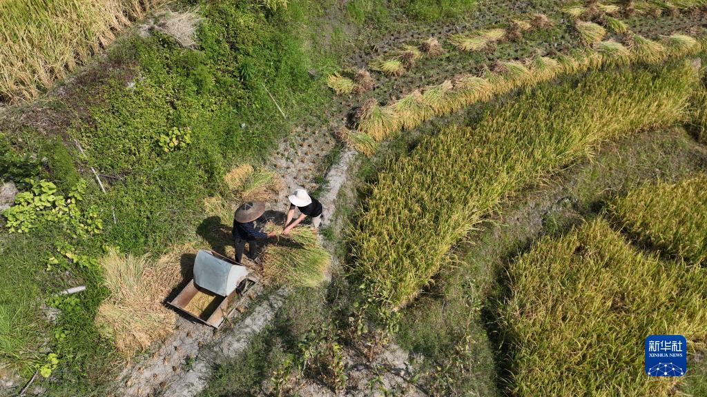 在中國農民豐收節即將到來之際,“世界灌溉工程遺產”“全球重要農業文化遺產”湖南省婁底市新化縣水車鎮紫鵲界梯田種植的水稻陸續進入成熟期,田野一片金黃,農民利用晴好天氣搶收搶割。