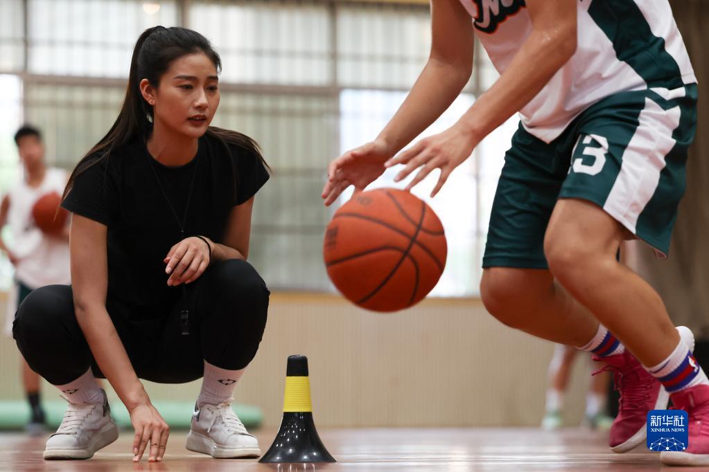 9月6日,于紅俊(左)在長沙市明德華興中學指導籃球隊隊員訓練。