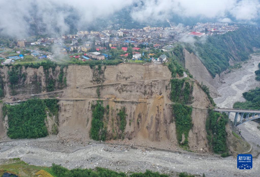 9月9日,搶險(xiǎn)人員在搶通磨西鎮(zhèn)附近道路(無(wú)人機(jī)照片)。
