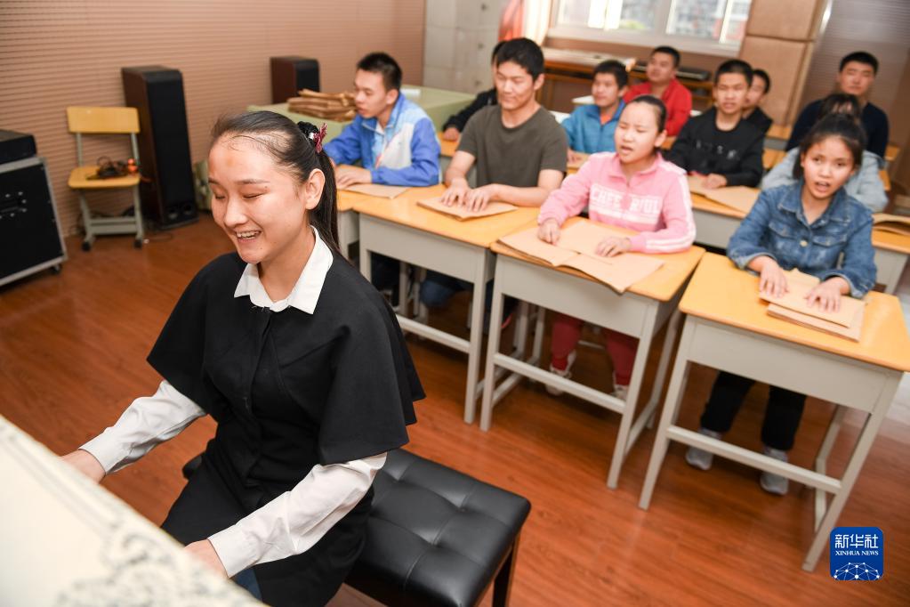 在安慶市特殊教育學校音樂教室里,張晨給盲生們上音樂課(2018年10月10日攝)。