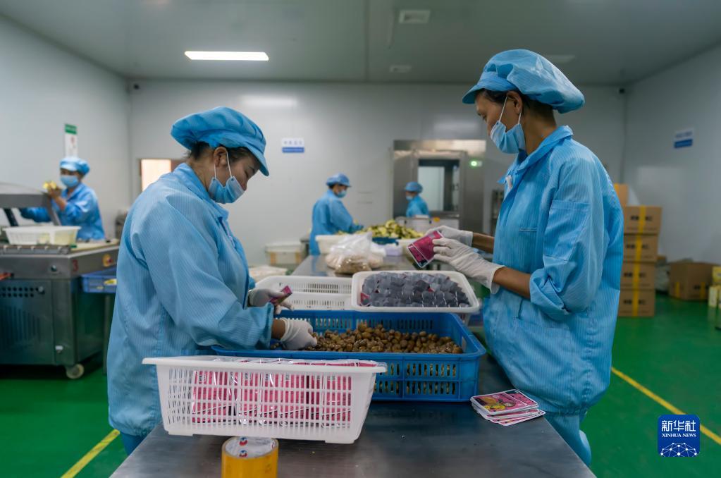 9月9日,在祿豐市中村鄉(xiāng)一家板栗加工企業(yè),工作人員將板栗裝袋。