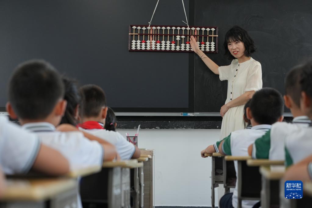 9月6日,在安徽省黃山市屯溪大位小學,汪素秋在課堂上講解珠算知識。