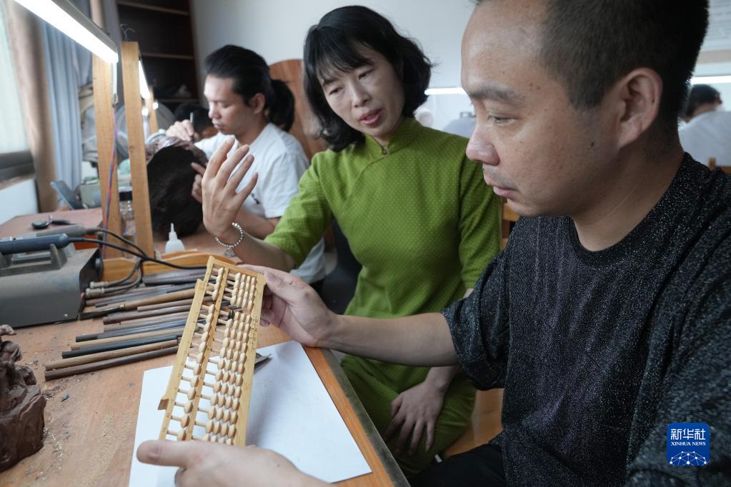 9月7日,在安徽省黃山市徽州區一家雕刻工作室,汪素秋與雕刻技師探討改進型算盤的制作工藝。