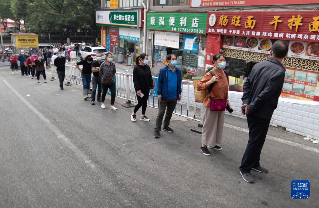 9月9日,市民在貴陽市觀山湖區碧海社區內排隊進入菜市場。