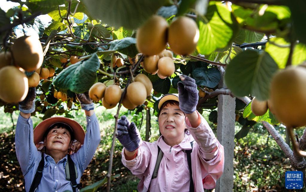 9月9日,當地村民在陜西齊峰果業城固基地采摘成熟的優質獼猴桃。