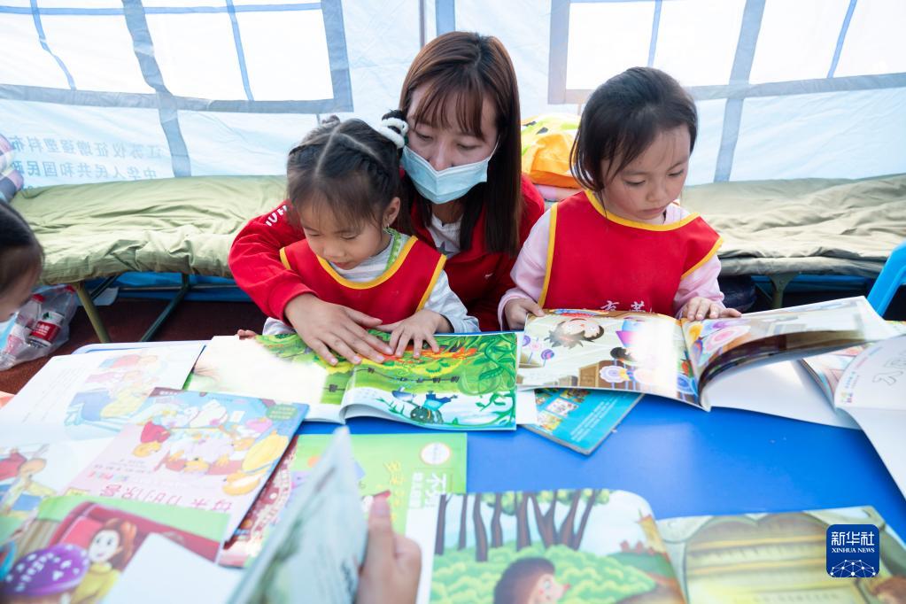 9月9日,在四川省石棉縣新民鄉海耳村臨時安置點,老師帶領孩子們看書。