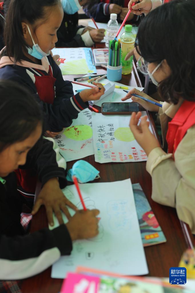 9月9日,在四川省石棉縣王崗坪鄉安置點內,志愿者在教小朋友畫畫。