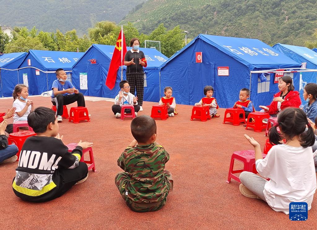 9月8日,在四川省石棉縣新民鄉海耳村臨時安置點,老師帶領孩子們做游戲。
