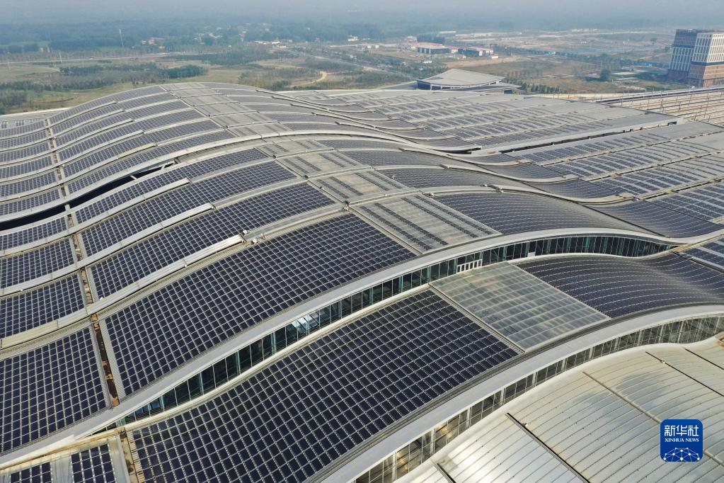京雄城際鐵路雄安站站頂分布式光伏電站(9月9日攝,無人機照片)。