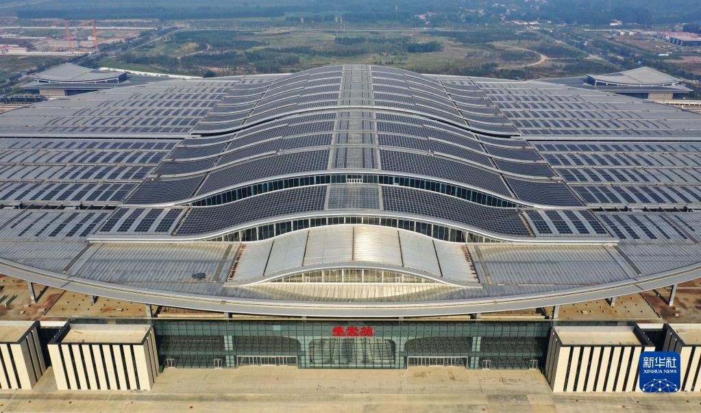 京雄城際鐵路雄安站站頂分布式光伏電站(9月9日攝,無人機照片)。