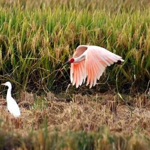 9月10日,朱鹮和白鷺在洋縣紙坊街道周家坎村稻田里停歇。