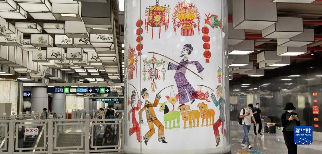 北京地鐵19號線平安里站內能夠旋轉的皮影燈柱(9月9日攝)。