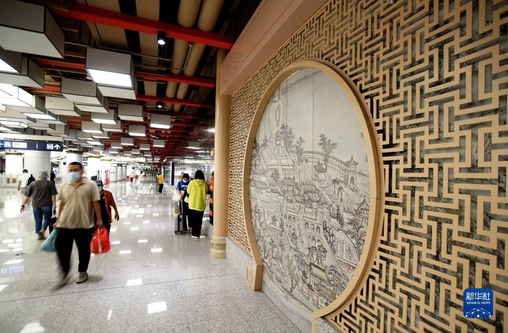 裝飾有中國古代山水畫壁畫的北京地鐵19號線站臺大廳(9月9日攝)。