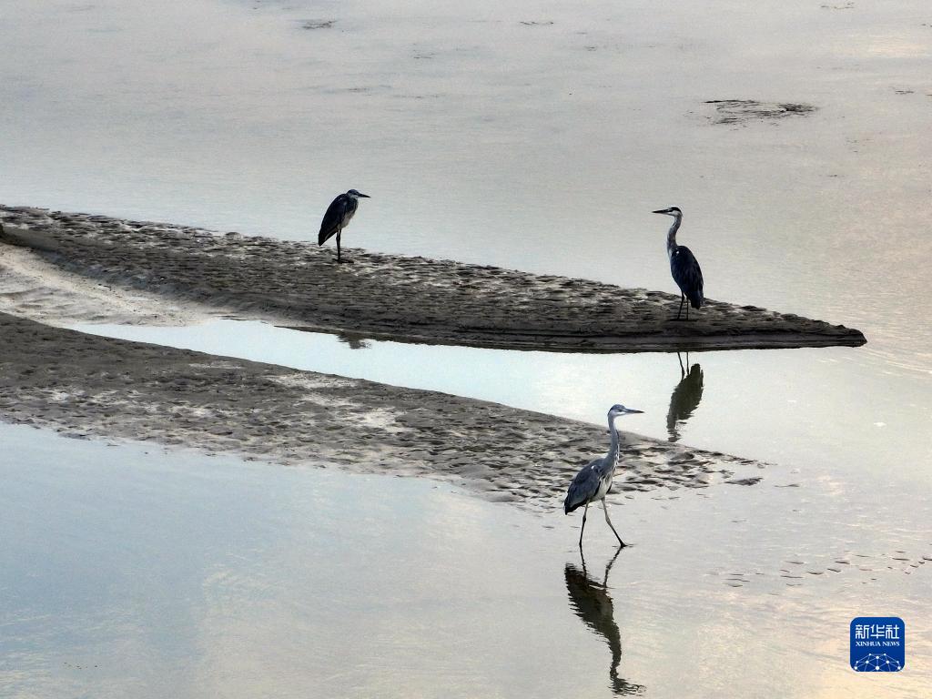9月10日,水鳥在武漢天興洲裸露灘涂停留(無人機照片)。