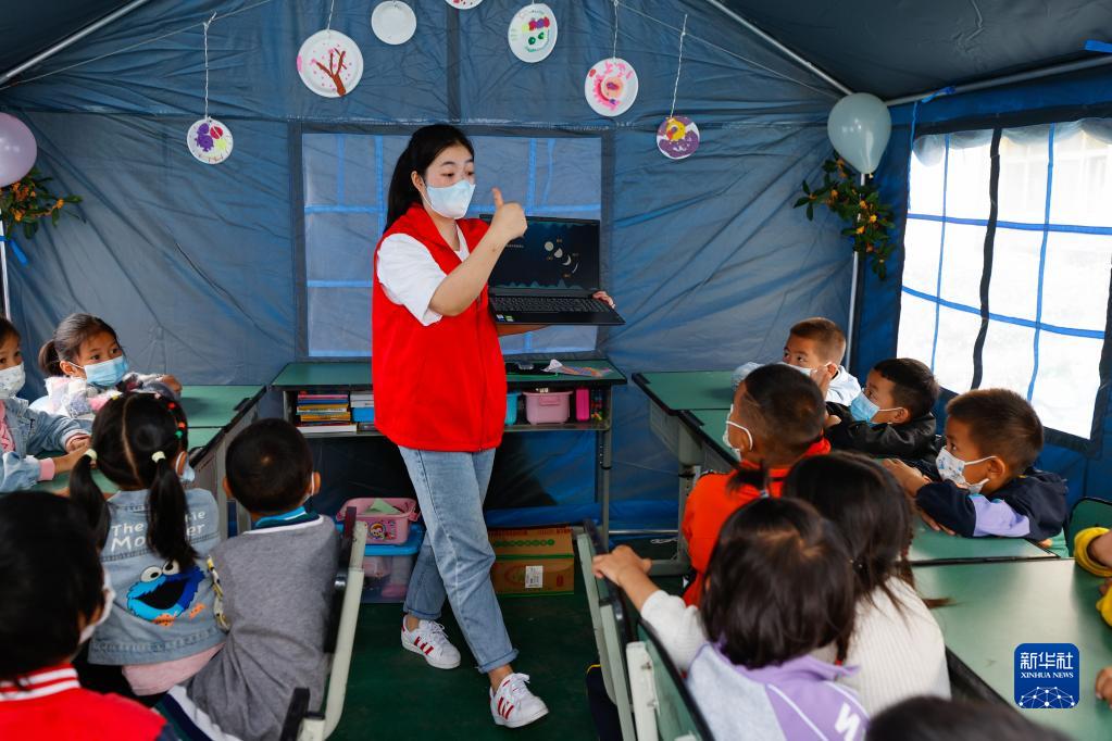 四川瀘定地震發(fā)生后,瀘定縣第二中學校成為臨時安置點,安置了受災(zāi)嚴重的得妥鎮(zhèn)的800多名村民,其中約有50名孩子。自9月6日開始,11名來自瀘定縣幼兒園和冷磧鎮(zhèn)幼兒園的老師帶領(lǐng)10名大學生和高中生組成志愿者服務(wù)團,在提供志愿服務(wù)的同時照料、陪伴這些孩子。