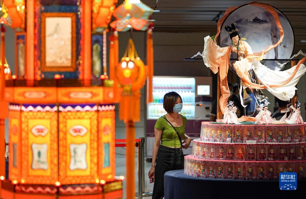 9月10日,觀眾在中國工藝美術館(也稱中國非物質文化遺產館)觀看非遺工藝品。中國工藝美術館舉辦中秋專場系列活動,集中展示花絲鑲嵌、北京雕漆、北京絹人等非遺項目。