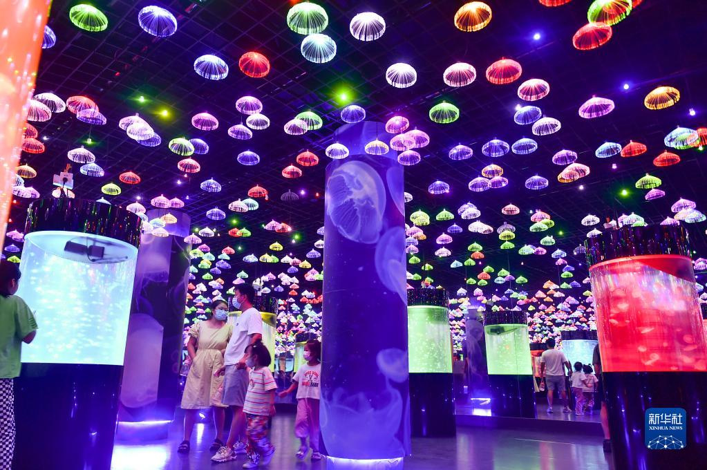 9月10日,市民和游客在河南省洛陽市龍門海洋館水母館游覽。