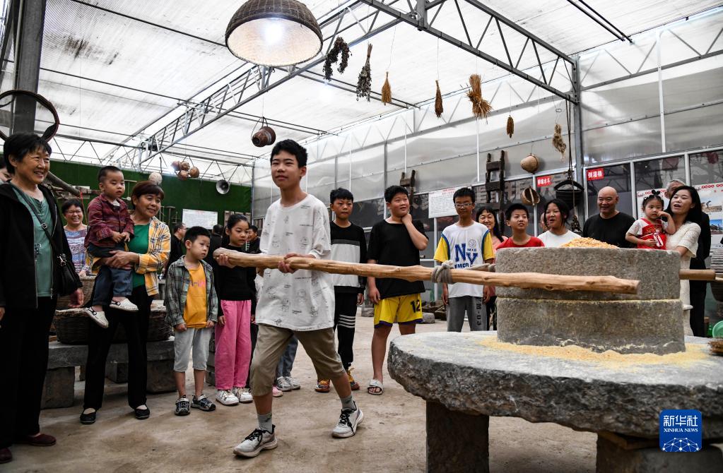 9月10日,在河南省濟源市民俗文化展覽館,一名小學生在體驗推磨。