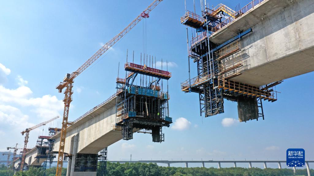 9月10日,建設(shè)者在浙江臺(tái)州市杭溫高鐵仙居特大橋施工(無人機(jī)照片)。