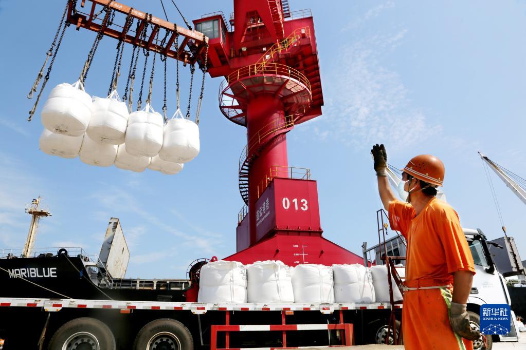 9月10日,碼頭工人在江蘇連云港港東方公司碼頭的泊位上作業。