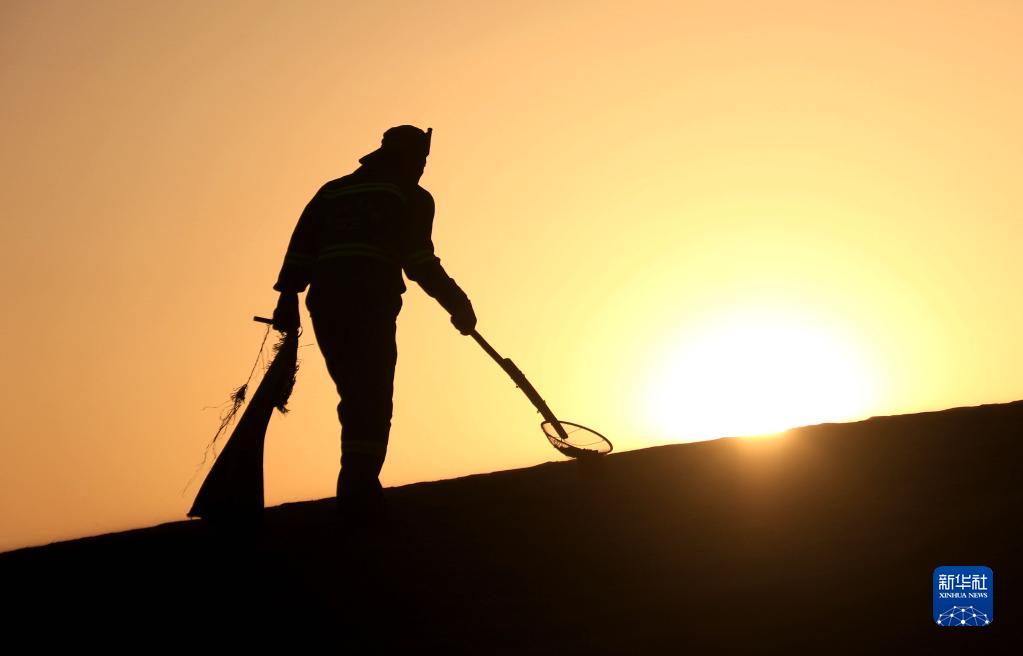 9月10日,保潔人員在甘肅敦煌市鳴沙山月牙泉景區保潔。