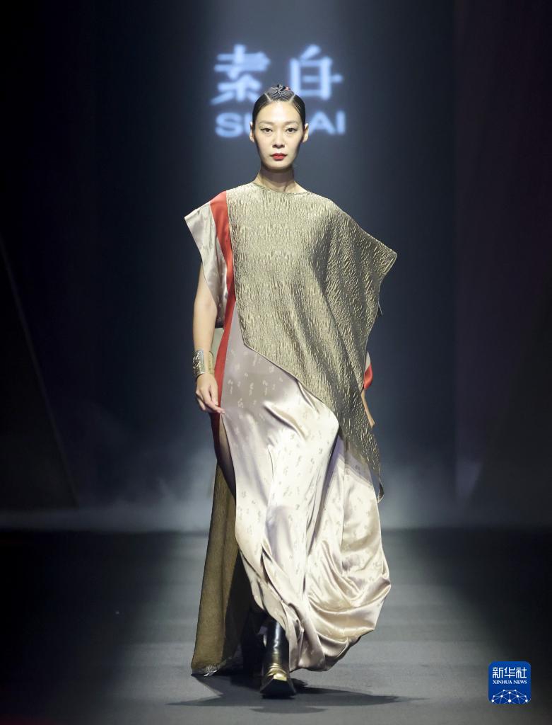 當日,“素白·馬乖”時裝發布會在北京中國國際時裝周(2023春夏系列)舉行。設計師推出50套用傳統“天然桑蠶絲織物”、具有古舊香云紗質感的環保面料等制作的時裝。