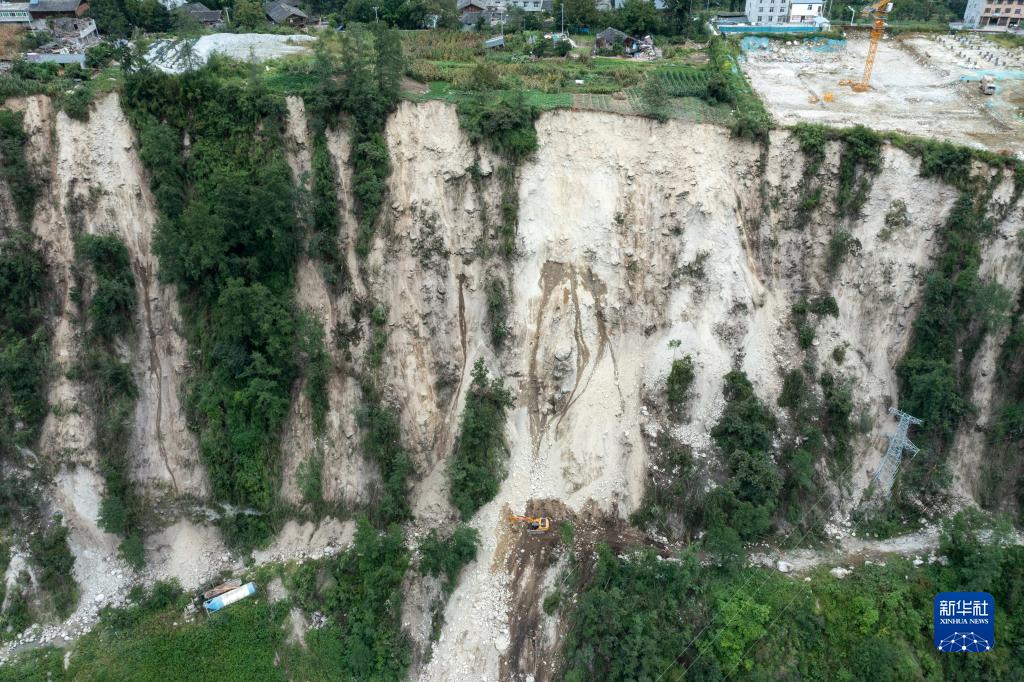 9月7日,在四川省甘孜州瀘定縣磨西鎮(zhèn)附近,四川路橋的工作人員在搶修通往海螺溝景區(qū)的道路(無人機(jī)照片)。