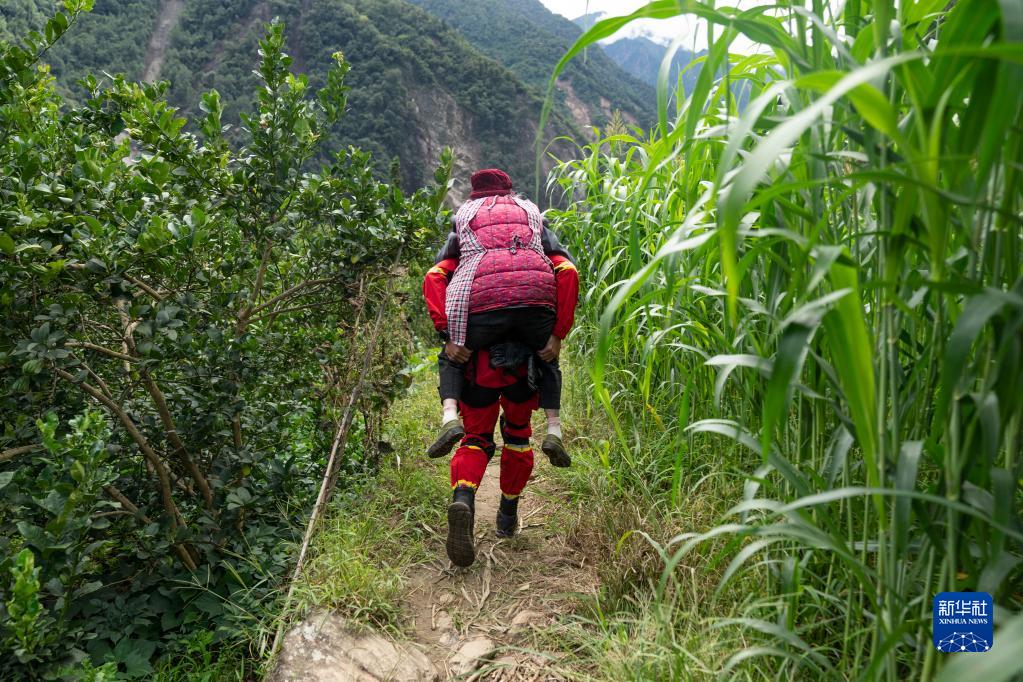9月10日,在四川省石棉縣王崗坪彝族藏族鄉(xiāng)幸福村,救援人員在轉(zhuǎn)運(yùn)患病老人。