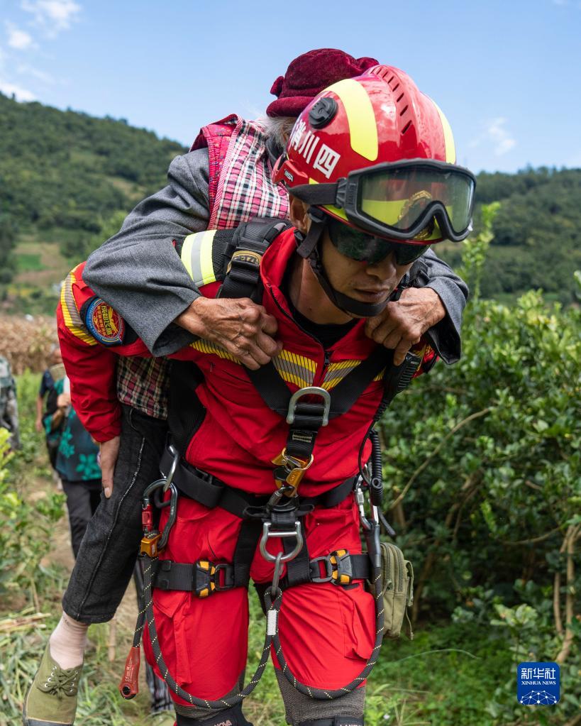9月10日,在四川省石棉縣王崗坪彝族藏族鄉幸福村,救援人員在轉運患病老人。
