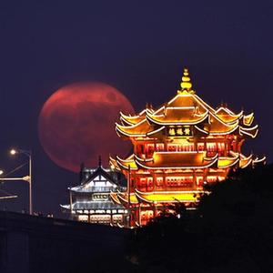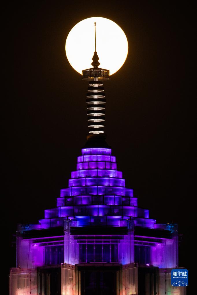 9月10日,圓月與江蘇南京大報恩塔相映成景。