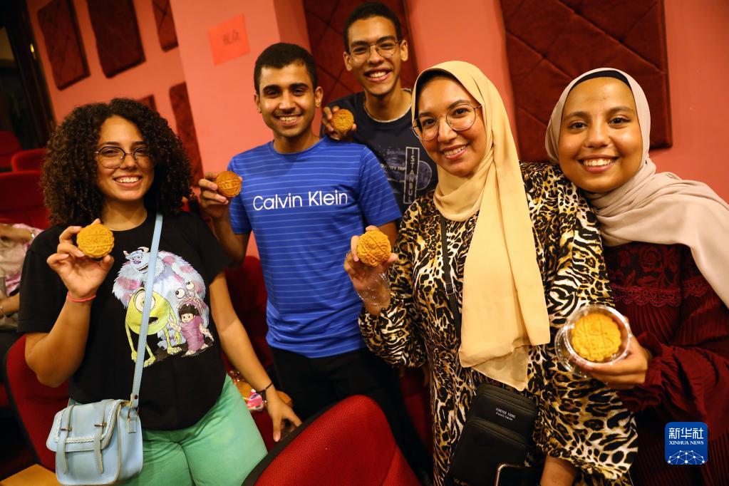 9月8日,在埃及開羅,來自埃及各高校的學生手拿月餅拍照。