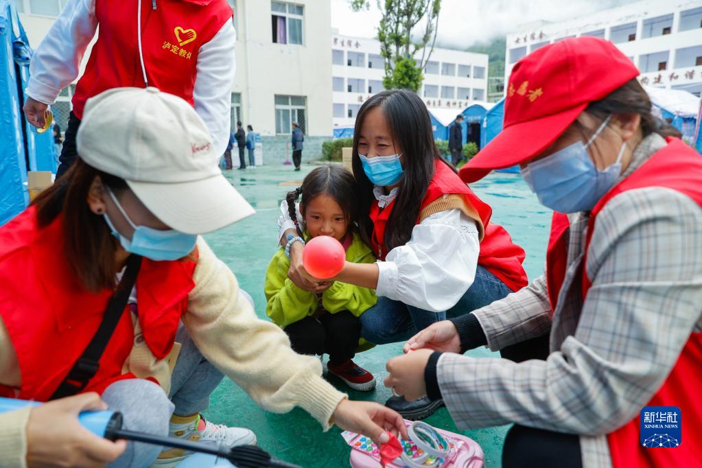 9月10日,在四川省甘孜州瀘定縣第二中學校地震災后臨時安置點,羅蓮(右二)帶著來自地震重災區得妥鎮的孩子一起吹氣球。