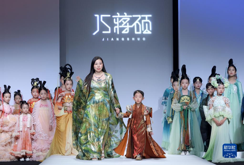 9月11日,設計師蔣碩(前中)和模特在在北京中國國際時裝周(2023春夏系列)舉行的“JS·蔣碩”童裝發布會上謝幕。
