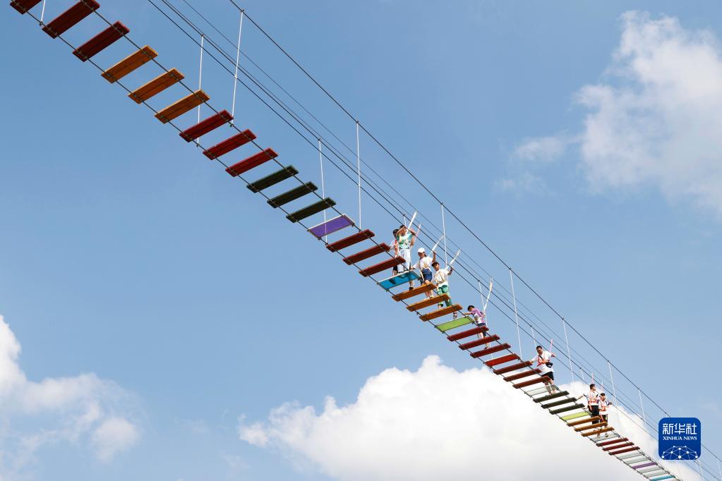 9月11日,在江蘇省宿遷市泗洪縣界集鎮(zhèn)夢幻樂園,游客在七彩玻璃橋上行走。