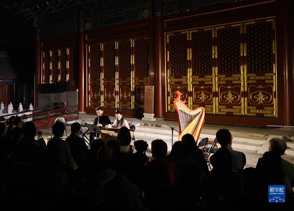 9月11日,民樂名家王溪(左)與吳茜在北京白塔寺內(nèi)演出。