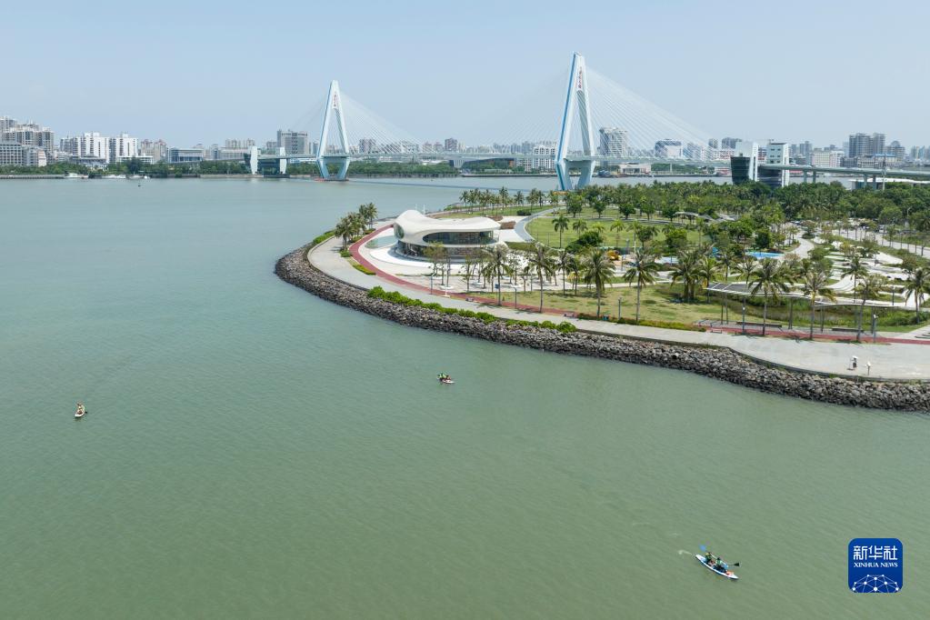 9月11日,市民在海南海口云洞圖書館附近水上休閑玩耍(無人機照片)。