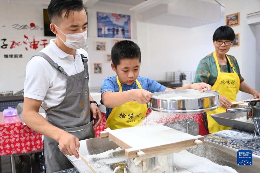 9月11日,小朋友在浙江省余姚市梁弄鎮(zhèn)參加研學(xué)體驗(yàn)時(shí)制作當(dāng)?shù)靥厣朗沉号蟾狻?/p>
