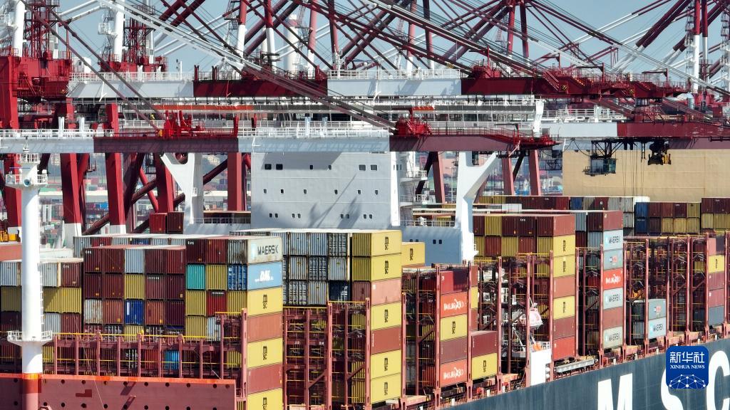 貨輪在山東港口青島港前灣三期集裝箱碼頭裝卸(9月10日攝,無人機照片)。