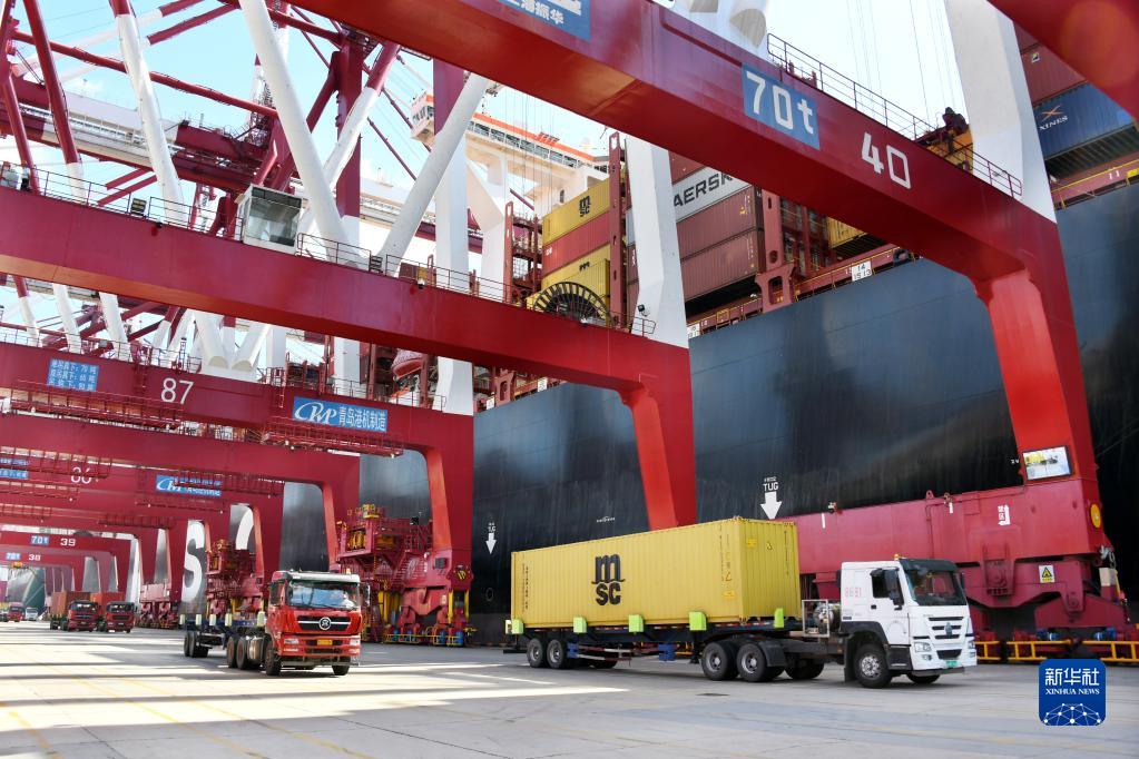 貨車在山東港口青島港前灣三期集裝箱碼頭運送集裝箱(9月10日攝)。