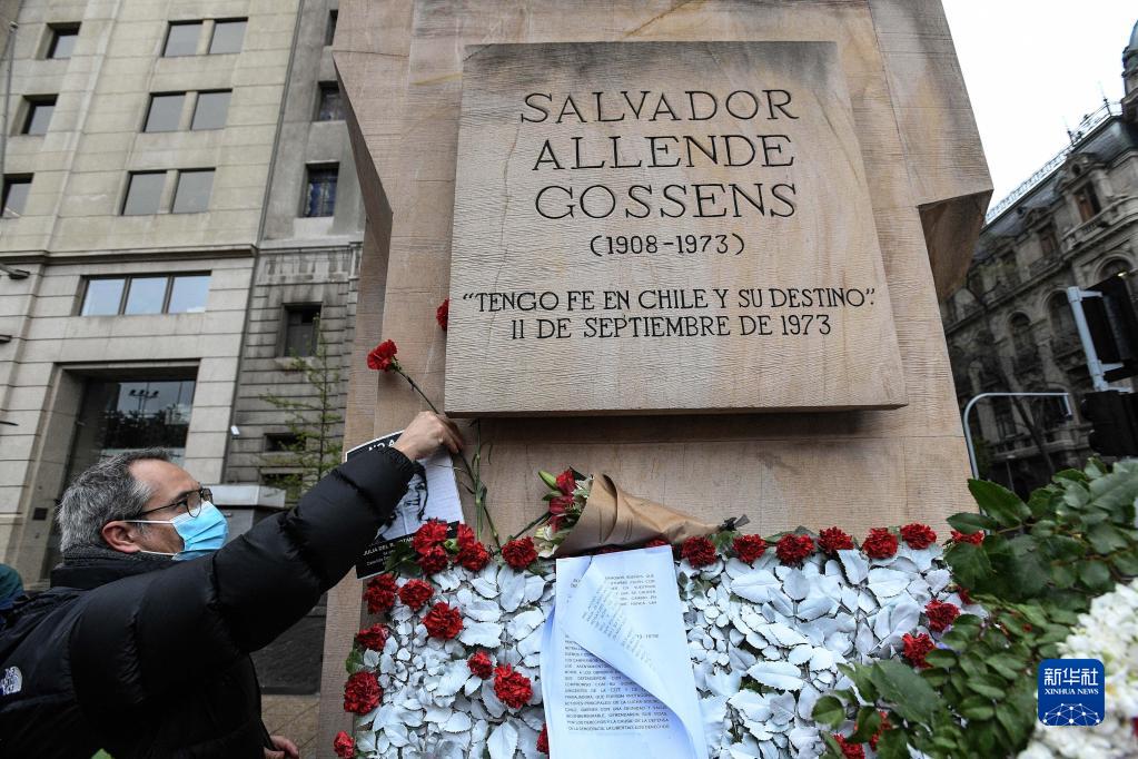 9月11日,在智利首都圣地亞哥,民眾在前總統阿連德雕像前獻花,紀念他遇難49周年。