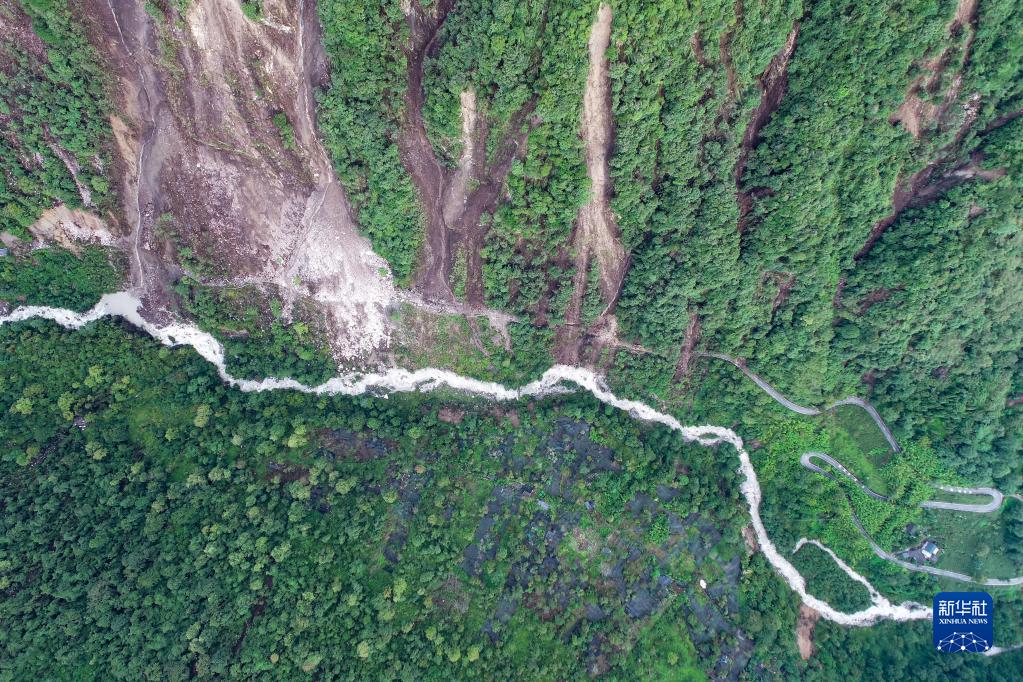 這是9月7日拍攝的海螺溝景區一號營地下游處的崩塌災害現場(左上部分)(無人機照片)。
