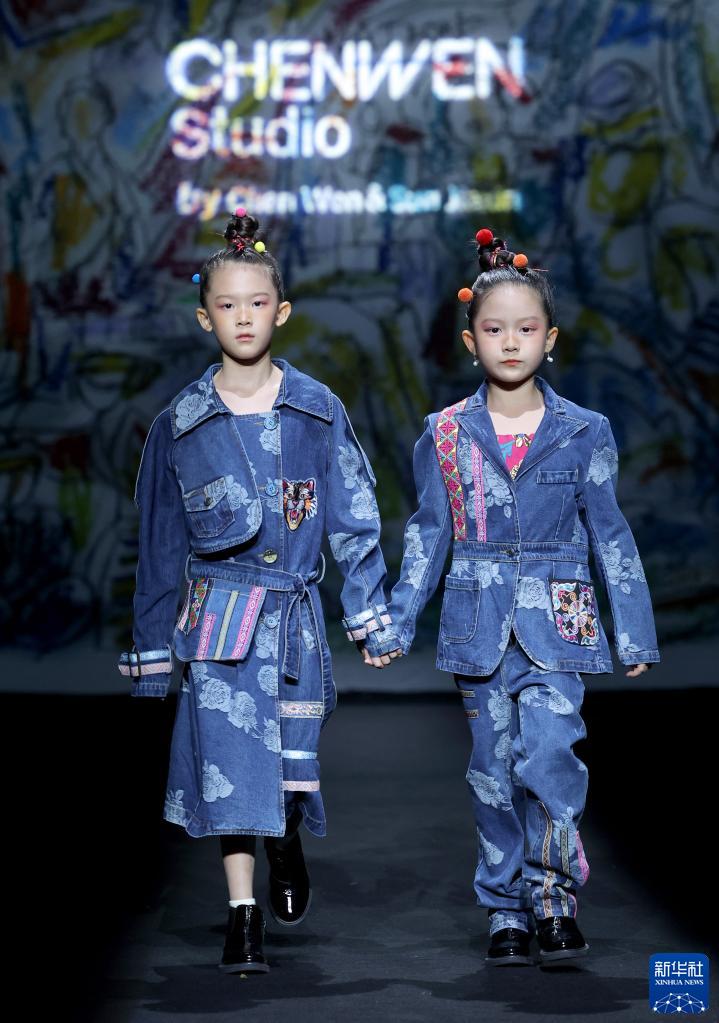 9月12日,模特在北京中國國際時裝周(2023春夏系列)舉行的“CHENWEN Studio·陳聞”牛仔親子裝發(fā)布會上展示時裝設(shè)計師陳聞設(shè)計的牛仔親子裝。