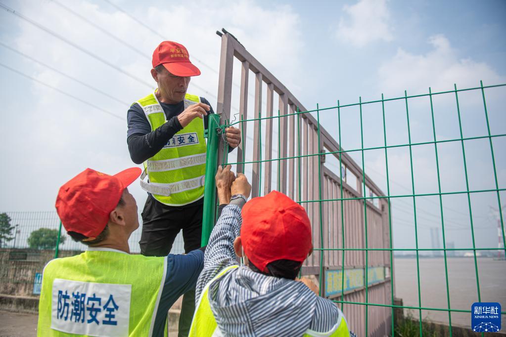 9月12日,防潮隊員傅幫華(上)等用隨身攜帶的鐵絲維修一處損壞的防護設施。