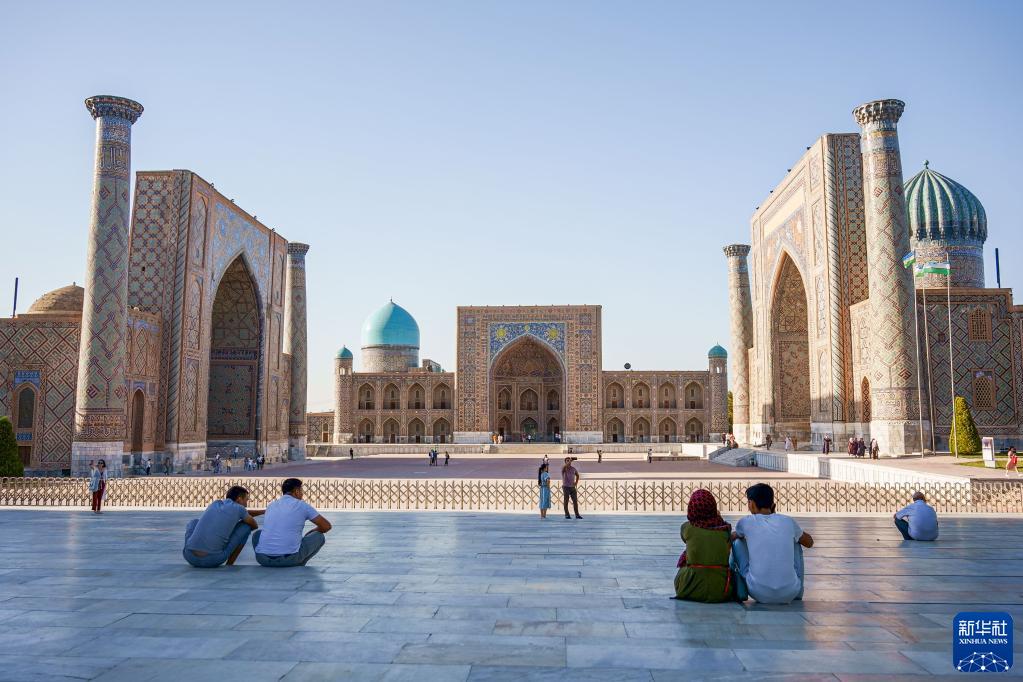 9月3日,人們在烏茲別克斯坦撒馬爾罕市列吉斯坦廣場游覽。