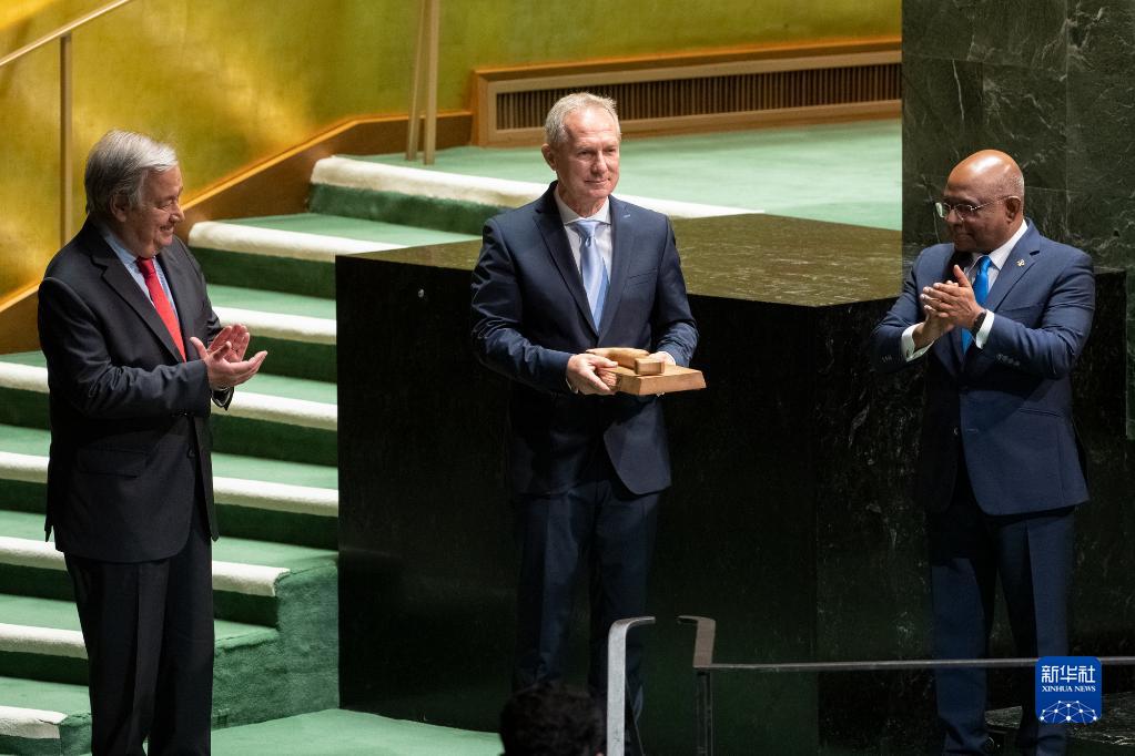 9月12日,在位于紐約的聯合國總部,第77屆聯合國大會主席克勒希(中)從上屆聯大主席沙希德(右)手中接過象征聯大主席權力的木槌。