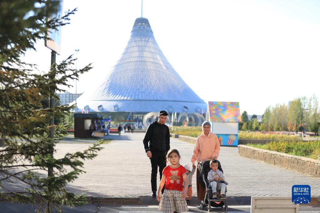 9月9日,在哈薩克斯坦努爾蘇丹,人們走過(guò)“可汗之帳”購(gòu)物中心。