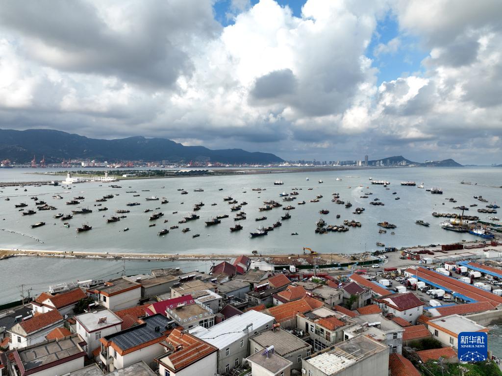 9月13日,漁船停泊在江蘇省連云港市連島中心漁港碼頭港灣躲避臺風(無人機照片)。