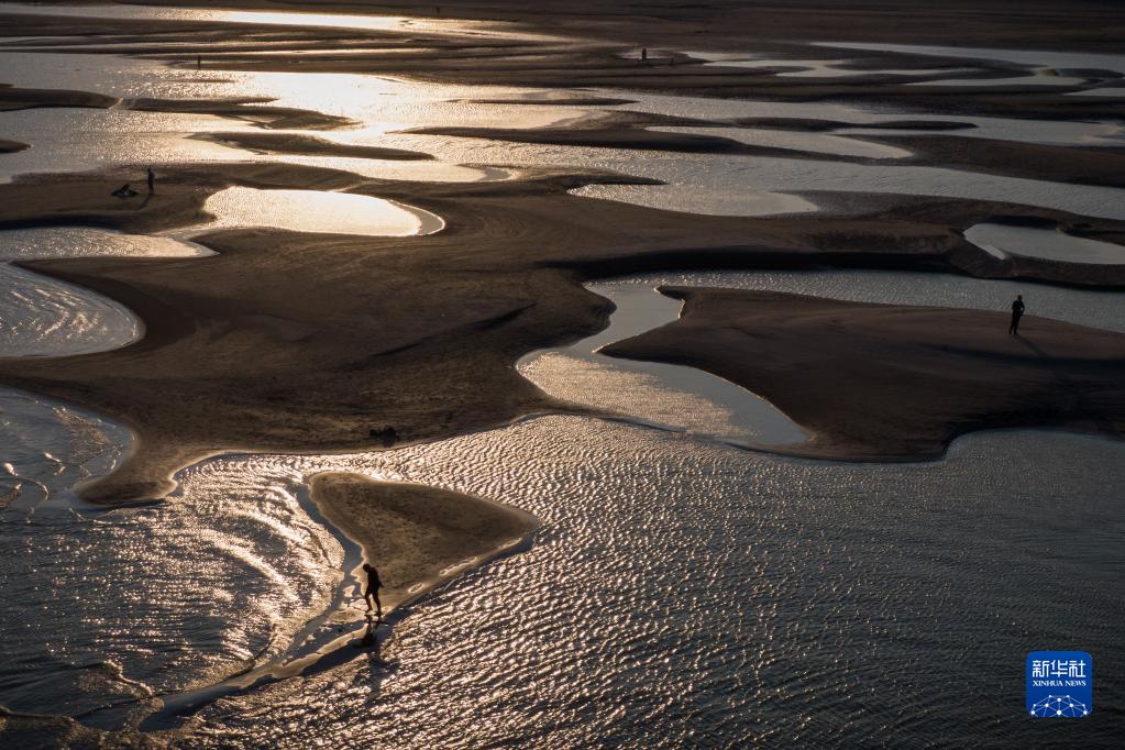 9月13日,市民在漢口江岸灘涂上游玩(無人機照片)。