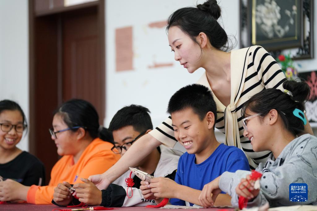 9月7日,在黑龍江撫遠(yuǎn)市烏蘇鎮(zhèn)抓吉赫哲族村,尚美含指導(dǎo)孩子們制作赫哲族手工藝品。